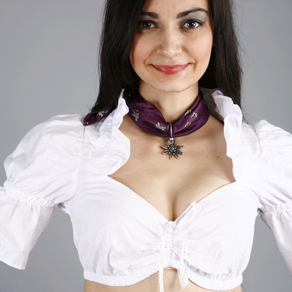 Die Dirndlbluse ist mit elastischem Gummiband unter dem Saum sowie an den Ärmeln eingenäht