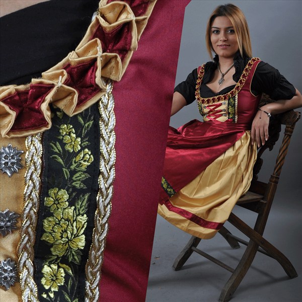 Das Gelb/Rote Oberteil ist mit Borte und besickten Bordüren besetzt.