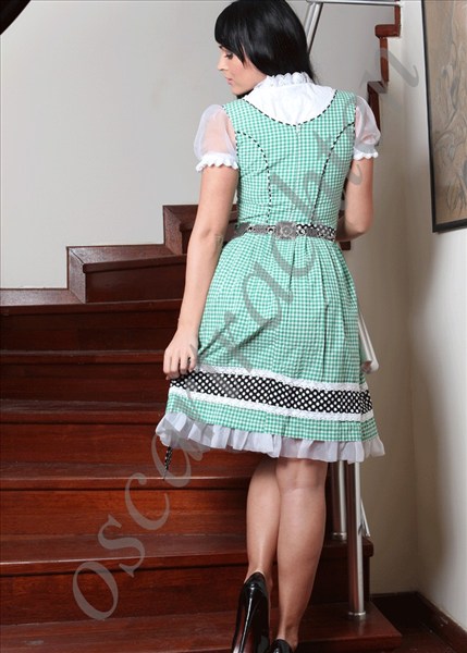 Der karierte Rock und die Schürze sind schön in Falten gelegt